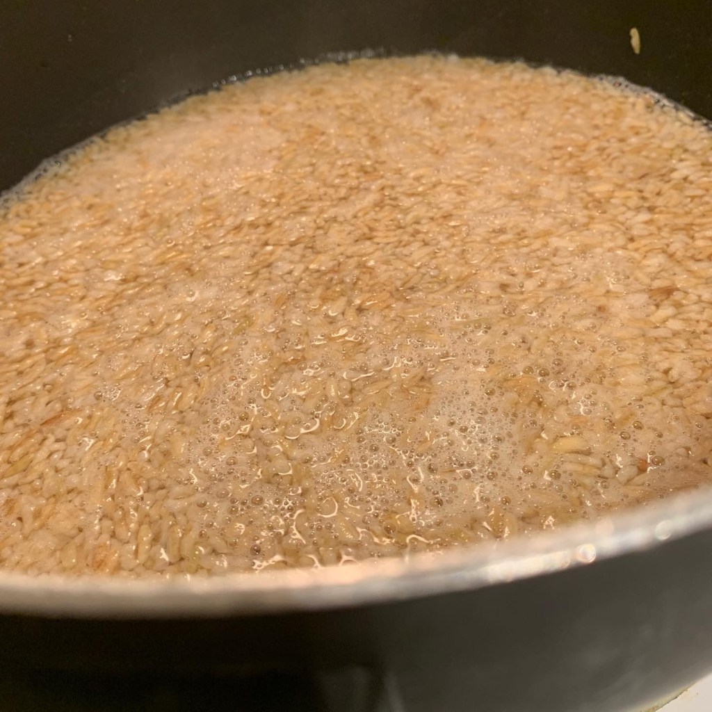 In case you have never made rice, you need one cup of water for each cup of rice. A little extra. So here I have two cups of rice, and at first I boiled the rice in 2.5 cups of water. As soon as I brought the rice and water to a boil, I reduced the heat to very low— BUT the rice has to boil before you lower it. After I lowered the heat to the lowest I could without turning it off. I covered the rice. It takes a sufficient amount of time, but once the rice sucks up ALL the water, it is done! At times this can happen, and the rice will still not be fully cooked. I taste the rice, if it is a little crunchy I know it’s not finished. So then I add a little more water, 1/2 to 1 cup, and boil it again. Then reduce heat. Same process. Until the rice sucks all the water up!