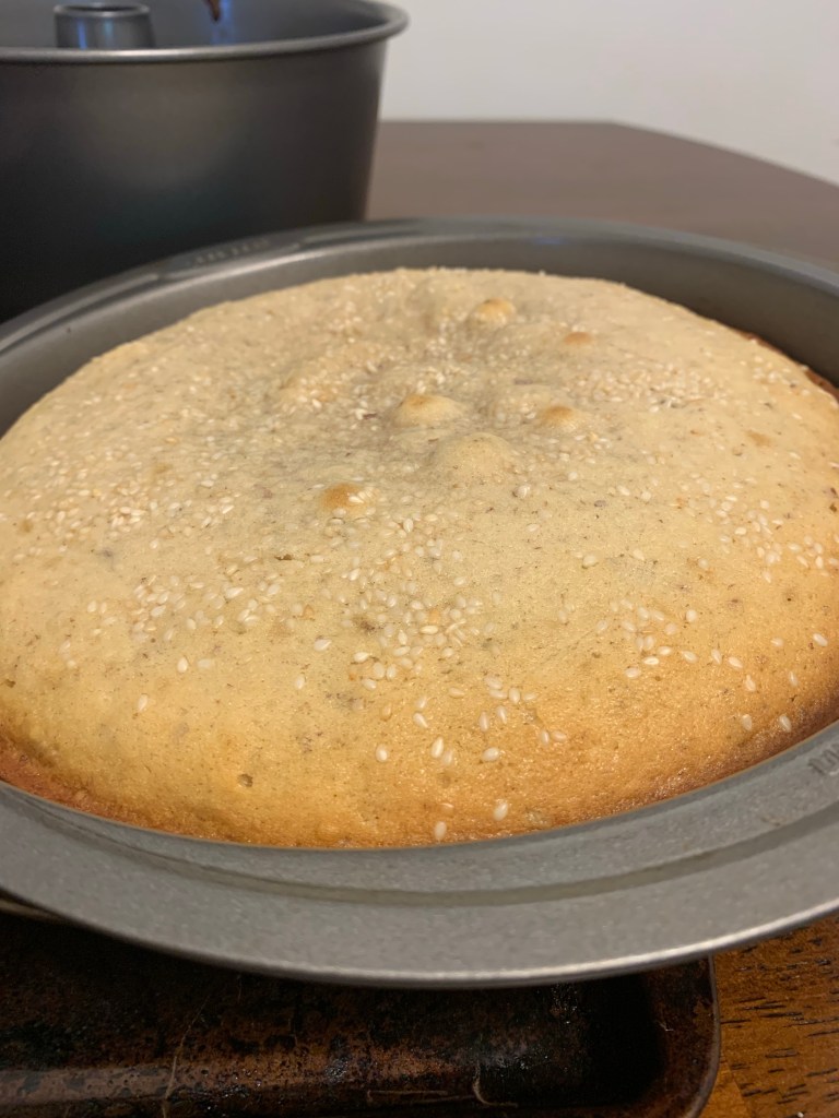 Then, place down parchment paper and lightly grease the parchment, make a loose “braid” with the three ropes. Pinch the ends together and tuck. You can just roll the ropes with your hand, again. Crack an egg into a dish and brush the loaf with the egg. Sprinkle sesame seeds (I toasted my sesame seeds first. Just put them on high heat in a pan for a few minutes). Sprinkle salt or sugar on top, whichever you prefer.