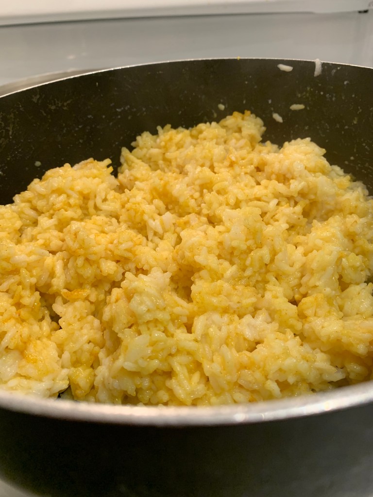 After that, you can start on the yellow rice!😃💛 Cook rice just like you would any other day: I am a big proponent of brown rice, but brown rice does not do good with yellow rice. So here I made long grain white rice, I think it is a little better for you than regular white, and I do not use a rice cooker.😅🤣