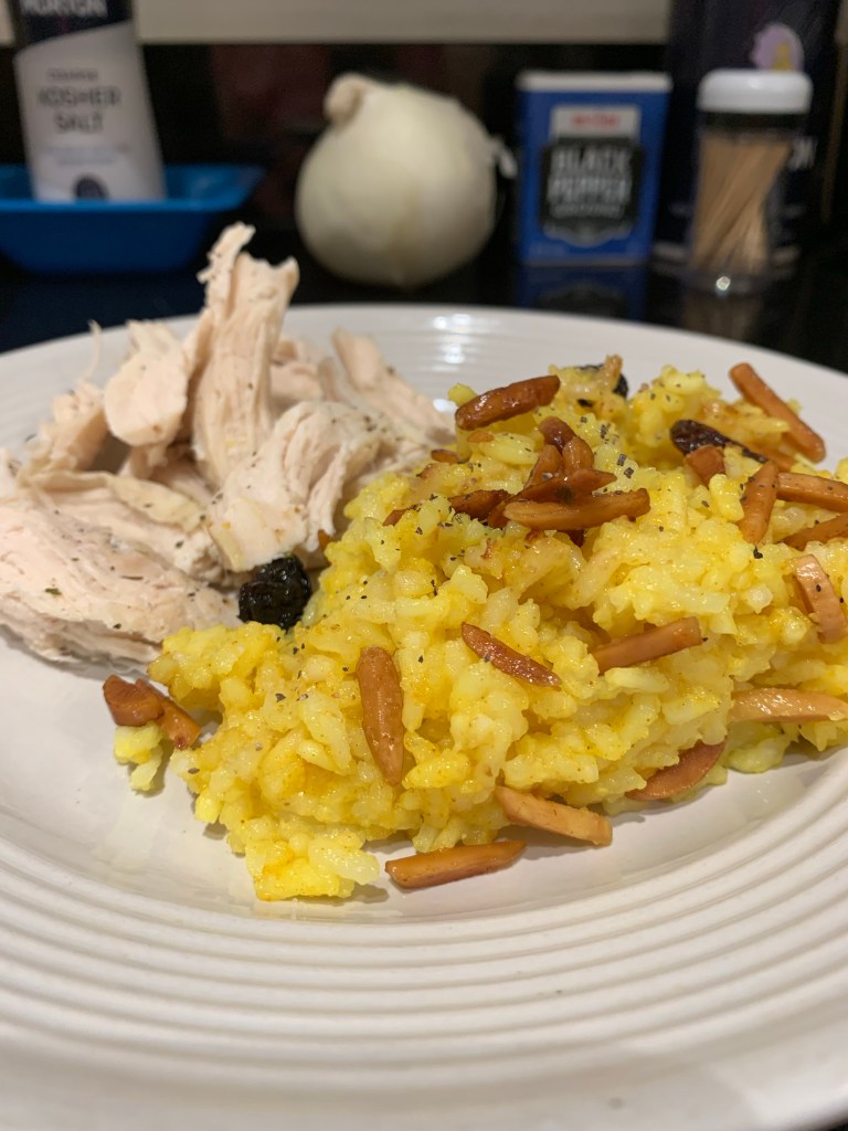 Some cultures enjoy eating “yellow” rice, and I loved to eat it while growing up! Here is the recipe: first, you have to make the chicken in the crock pot. The nice thing about shredded crock pot chicken is it can be frozen and does not need to be thawed when you put it in. Add the 2 chicken breast pieces, dash it with salt and pepper (garlic is optional), add 1-2 tablespoons of butter. Also add 2 cups of water so the chicken does not stick. Here is a pic of step one: