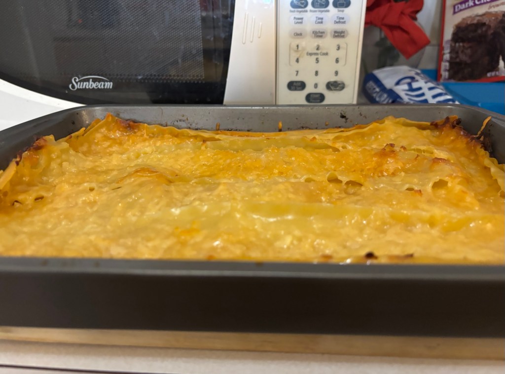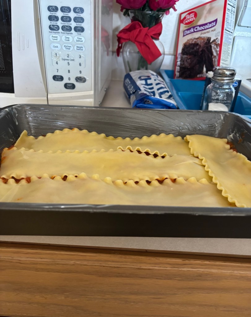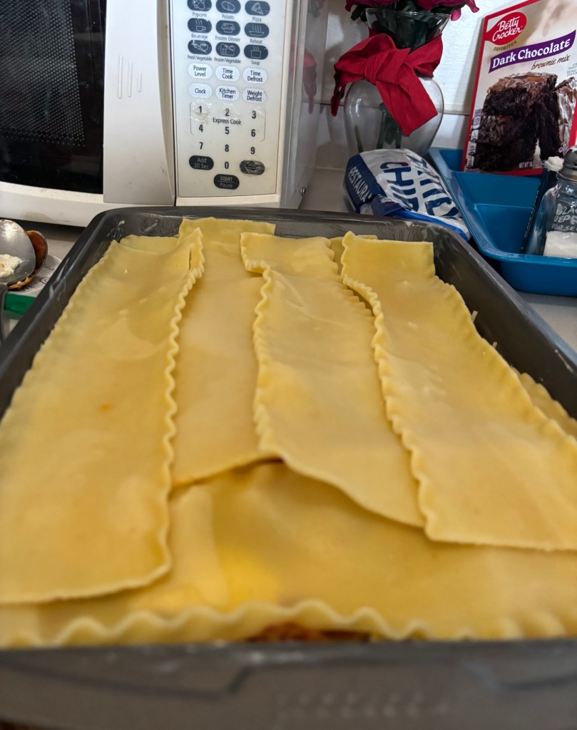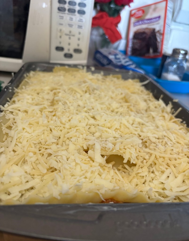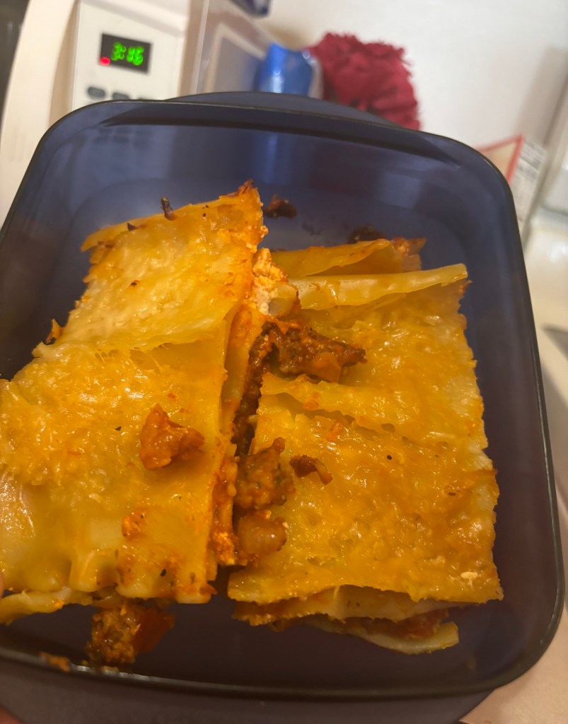 So this is the meat mixture, first I caramelized a chopped onion, then I added the Bob Evans, Italian pork sausage – cooked it up real well – and of course, added some salt and pepper. After this was cooked, I added Prego meat sauce.With the Prego meat sauce! All you need to do is bring this to a boil for a few minutes!You’re going to need to boil about 15 to 20 of these lasagna noodles, at the minimum, 12 because that will make for three full layers.Chill the noodles before you bake, it does make for tastier lasagna noodles.You can use baking spray – cooking spray should work also – I happen to like real unsalted butter. So I just spread it!This is the meat sauce, a.k.a., Prego sauce with meat and Italian beef pork sausage mix (in the pic above) – it was mixed with caramelized onions, and some salt and pepper, remember?! What a combination! After you add the first layer of meat sauce (visible underneath), then you add the FIRST layer of lasagna (chilled) noodles.Then I topped it with Mozzarella and Parmesan, shredded cheese! So: 1) the Bottom layer is the meat sauce, 2) and then add the first layer of noodles 3) then add another layer of meat sauce and THEN the RICOTTA cheese, and finally, your layer of Mozzarella!Repeat! I believe I’m on noodle layer two or three, so finally, just top it with Mozzarella and Parmesan cheese!Take a look at the beauty ready to go into the oven at 350-365 F, for a minimum of 45 minutes. Please note: cooking times may vary.And Voilà! You have a yummy delicious baked pan of lasagna. I’m so thankful for my pizza slicer. Lol 🍝Always store in Tupperware or glass. You can keep it in the fridge for up to 3 to 5 days and you can even freeze.