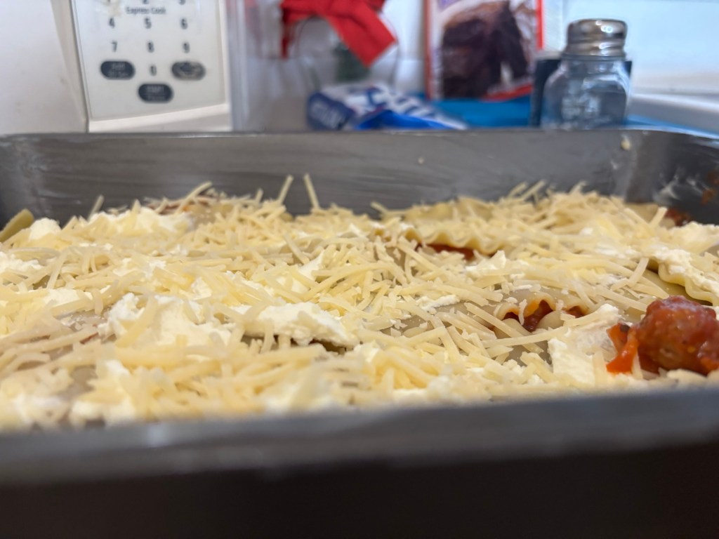 I hope you enjoyed the photos, and I hope that gives some explanation! The idea is to make it the way you like. To summarize, I first chopped an onion, and then caramelized it, and then I added Italian beef pork, and sausage, and after that, I cooked it together with the onion and added some salt and pepper. Once you’re finished, you can add Prego meat sauce and mix it up really well. And there you will have your meat sauce layer. Then you add that to a greased baking pan as noted in the photo. After you add that to your greased baking pan, you add the next layer, which is the layer of boiled lasagna noodles. Once you add your layer of boiled lasagna noodles, you add another layer of meat sauce, then a layer of ricotta, then a layer of Mozzarella and Parmesan, shredded cheese. And you repeat the process by adding another layer of noodles, more meat sauce, more ricotta, mozzarella, etc. There are many variations to making a great lasagna. Typically you have three layers. I was very pleased with how mine turned out.