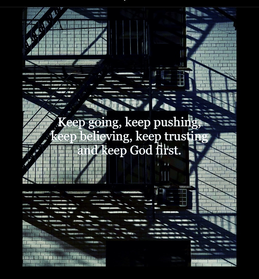 I am writing this to encourage you but also posting it to encourage myself. “Keep pushing. Keep believing. Keep trusting and keep going.”More importantly: “KEEP GOD FIRST.” I fail at this at times. My anger, frustrations, restlessness, and resentments get the best of me. But one of my prayers, especially lately is to seek God above all. As the Bible tells us, ‘Seek ye first God and his righteousness and ALL else shall be added on to you.’ Seek God first. This is my prayer. Sometimes seeking God first can be difficult. We are called to do things we would rather not do, called to face situations that are rather difficult, and have to deal with people that can be unbearable. But when we try our best to follow: he gives us the strength to go down to the valley, to encounter the unexpected, to face the most grave of situations, and he brings us out victorious! “God disciplines us for our good…”